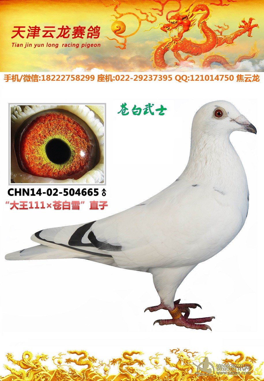 鸽子名称: 足环:2014-02-504665 性别:♂雄鸽 眼别:黄 羽色:白 年代:2014 血统:苍白骑士 作育者:焦云龙