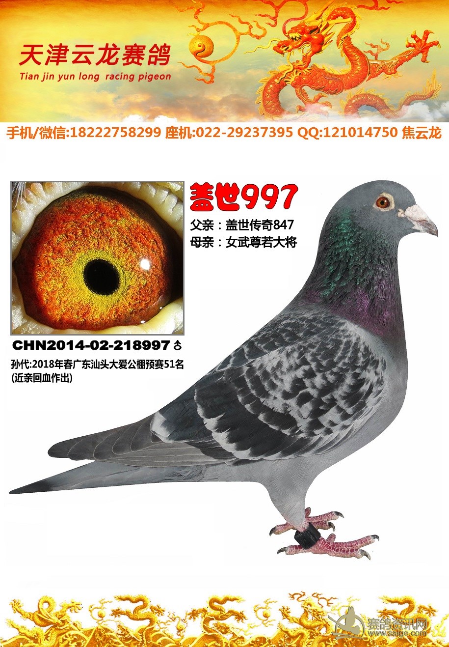 鸽子名称: 足环:2014-02-218997 性别:♂雄鸽 眼别:黄 羽色:斑 年代:2014 血统:盖世×若大将 作育者:焦云龙