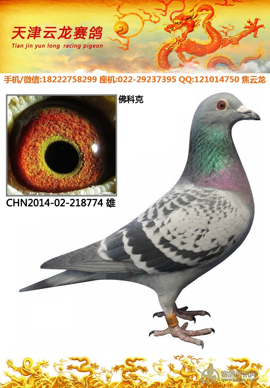 鸽子名称: 足环:2014-02-218774 性别:♂雄鸽 眼别:黄 羽色:斑 年代:2014 血统:佛科克 作育者:焦云龙