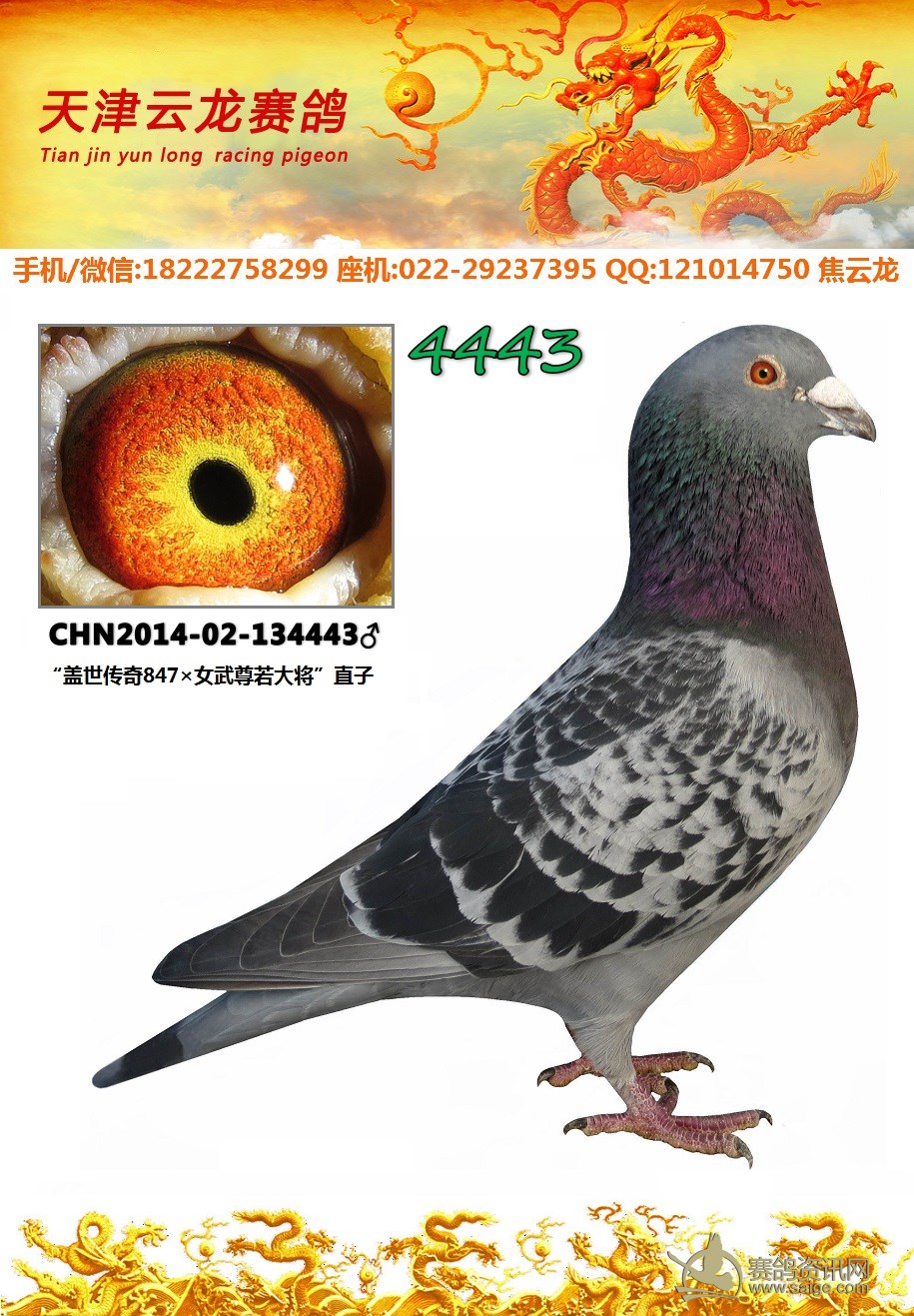 鸽子名称: 足环:2014-02-134443 性别:♂雄鸽 眼别:黄 羽色:斑 年代:2014 血统:盖世 作育者:焦云龙