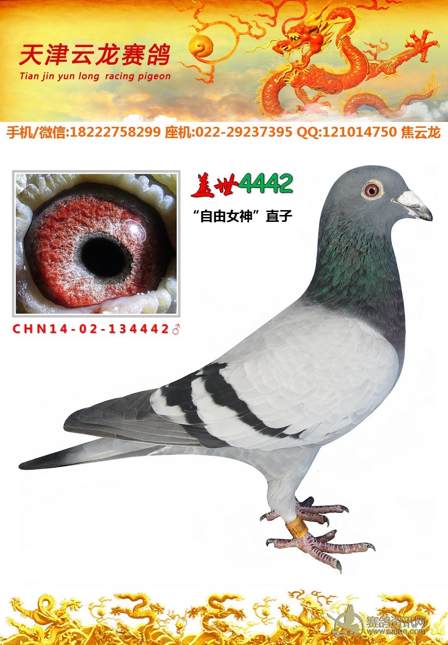 鸽子名称: 足环:2014-02-134442 性别:♂雄鸽 眼别:黄 羽色:灰 年代:2014 血统:盖世 作育者:焦云龙