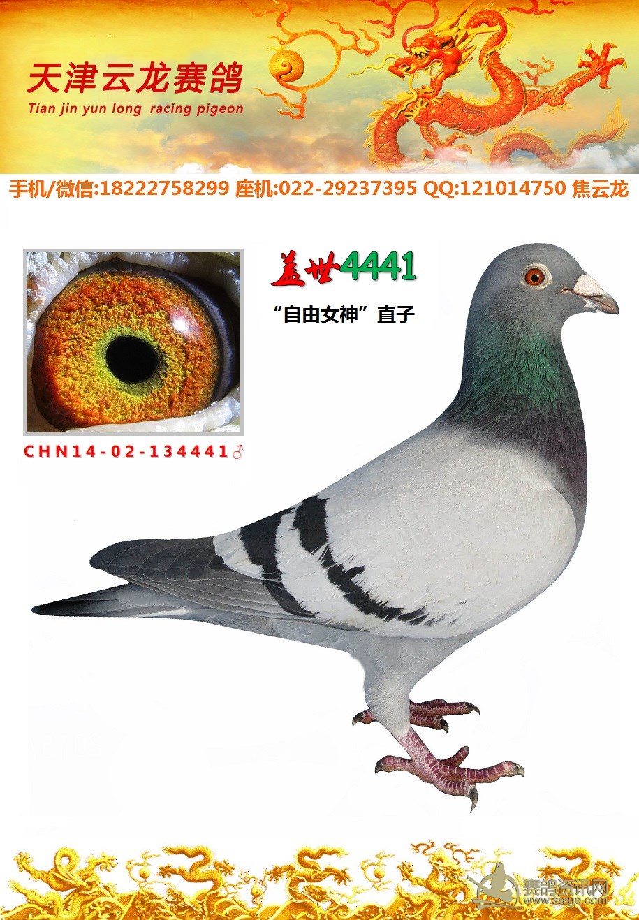鸽子名称: 足环:2014-02-134441 性别:♂雄鸽 眼别:黄 羽色:灰 年代:2014 血统:盖世 作育者:焦云龙