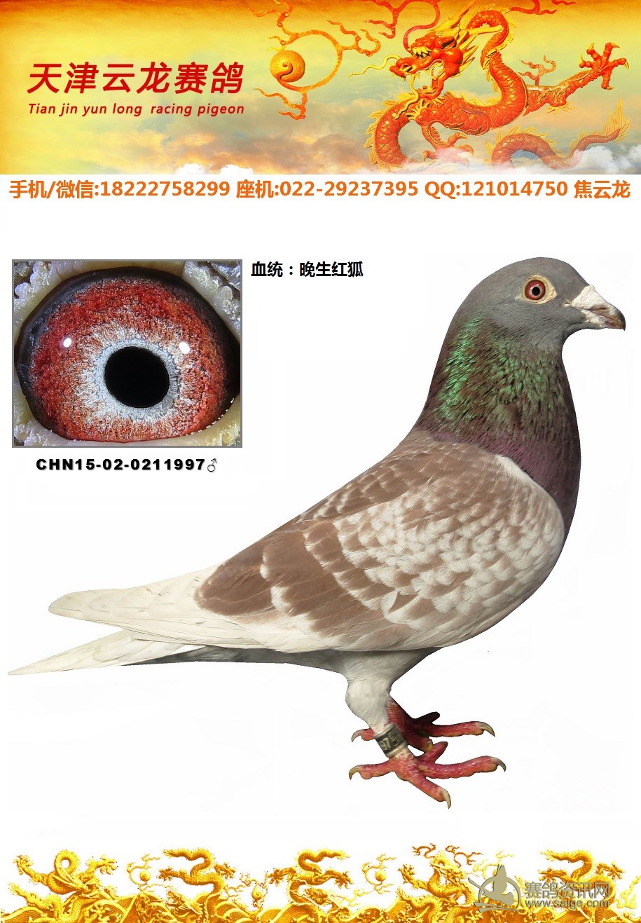 鸽子名称: 足环:2015-02-0211997 性别:♂雄鸽 眼别:砂 羽色:红斑 年代:2015 血统:詹森 作育者:焦云龙