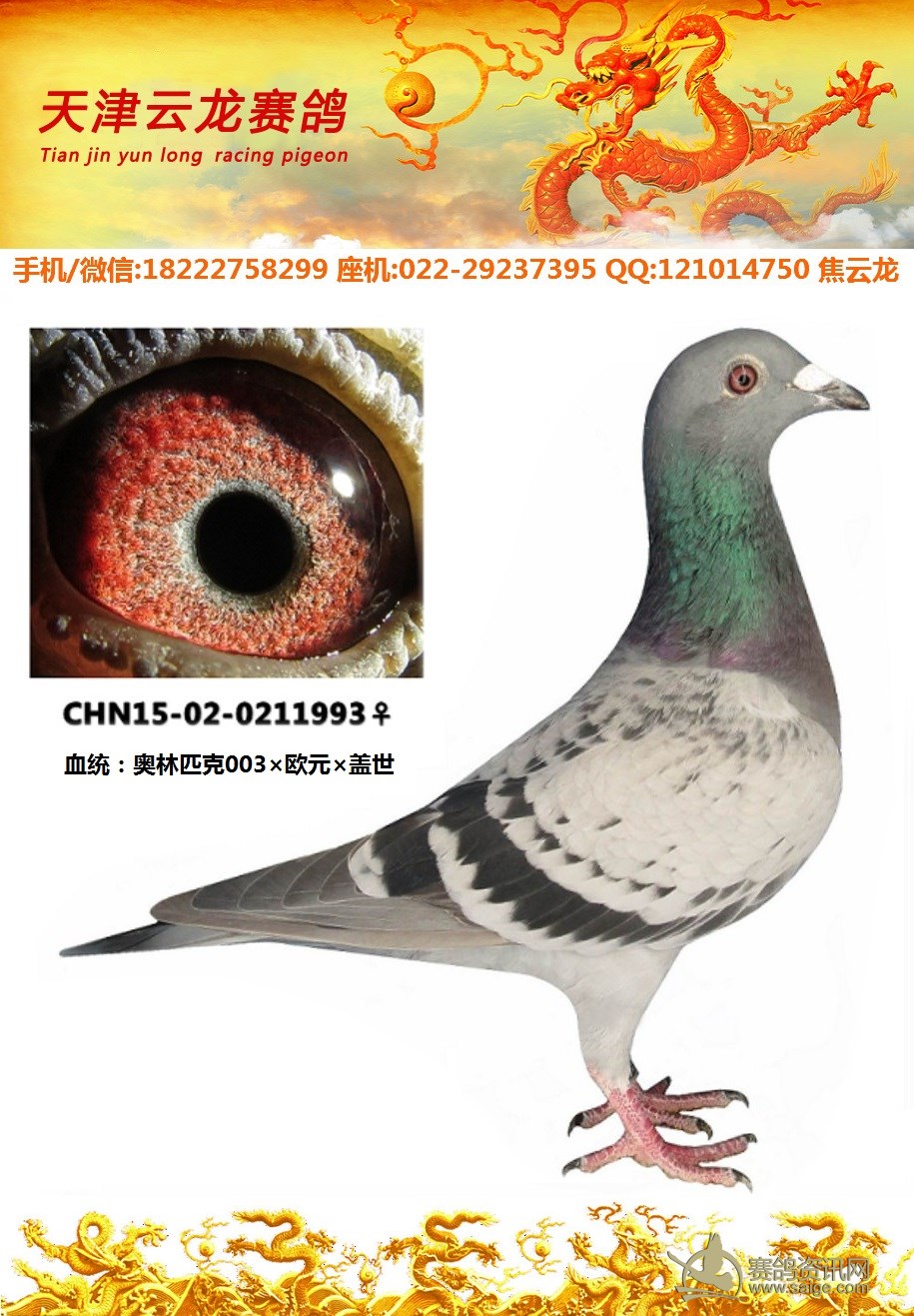 鸽子名称: 足环: 性别:♀雌鸽 眼别: 羽色: 年代:2015 血统: 作育者:焦云龙