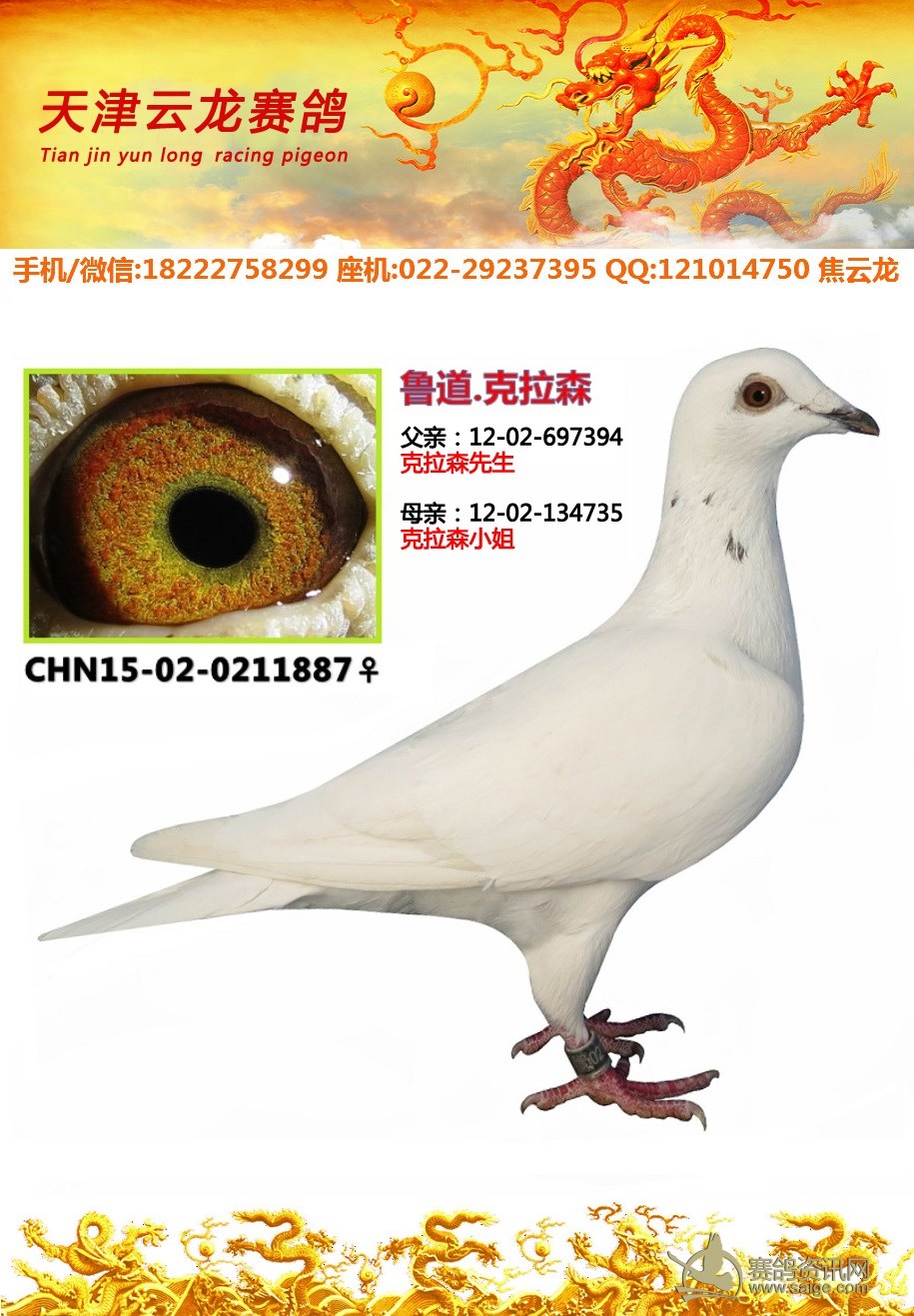鸽子名称: 足环:2015-02-0211887 性别:♀雌鸽 眼别:黄 羽色:白 年代:2015 血统:鲁道 作育者:焦云龙