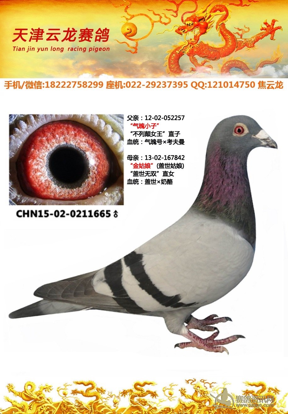 鸽子名称: 足环:2015-02-0211665 性别:♂雄鸽 眼别:砂 羽色:灰 年代:2015 血统: 作育者:焦云龙