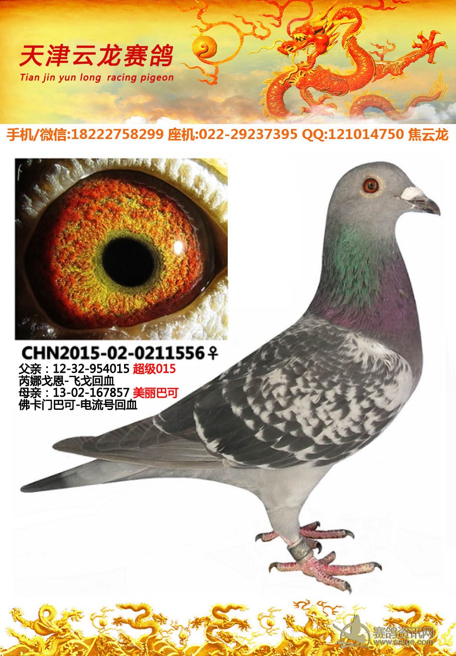 鸽子名称: 足环:2015-02-0211556 性别:♀雌鸽 眼别:黄 羽色:黑斑 年代:2015 血统:芮娜×佛卡门 作育者:焦云龙