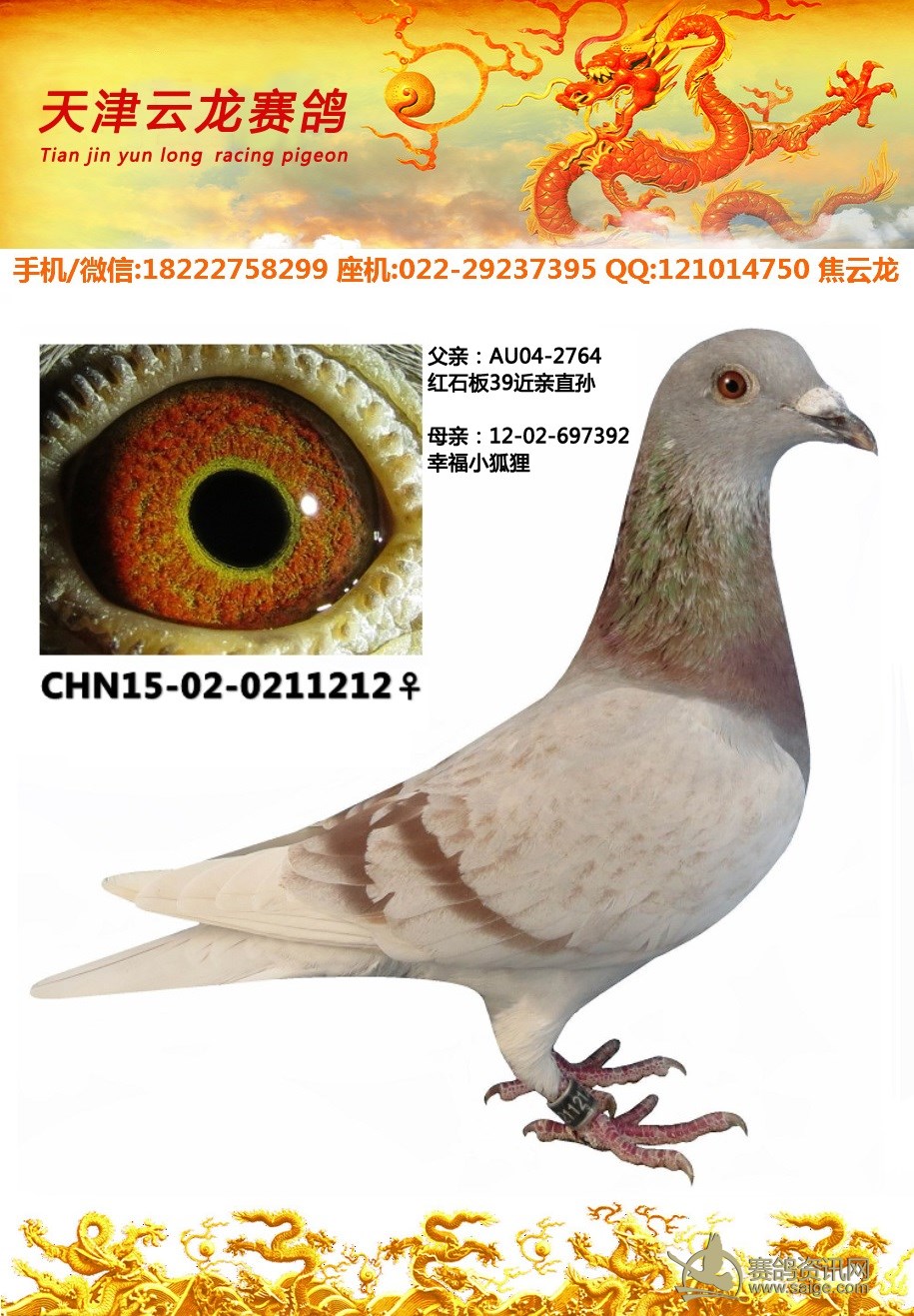 鸽子名称: 足环:2015-02-0211212 性别:♂雄鸽 眼别:黄 羽色:红轮 年代:2015 血统:詹森 作育者:焦云龙