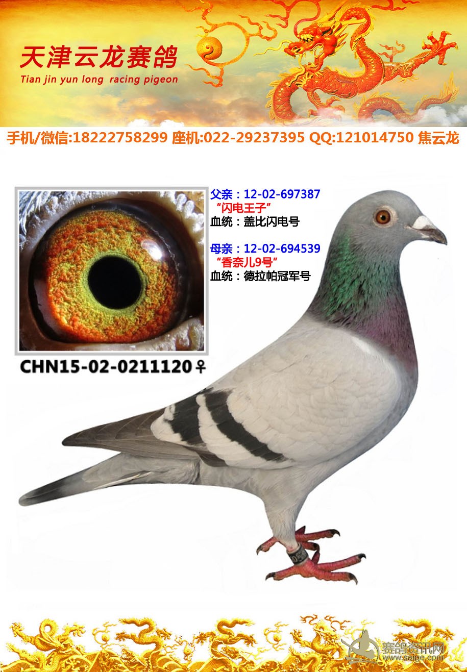 鸽子名称: 足环:2015-02-0211120 性别:♀雌鸽 眼别: 羽色: 年代:2015 血统: 作育者:焦云龙