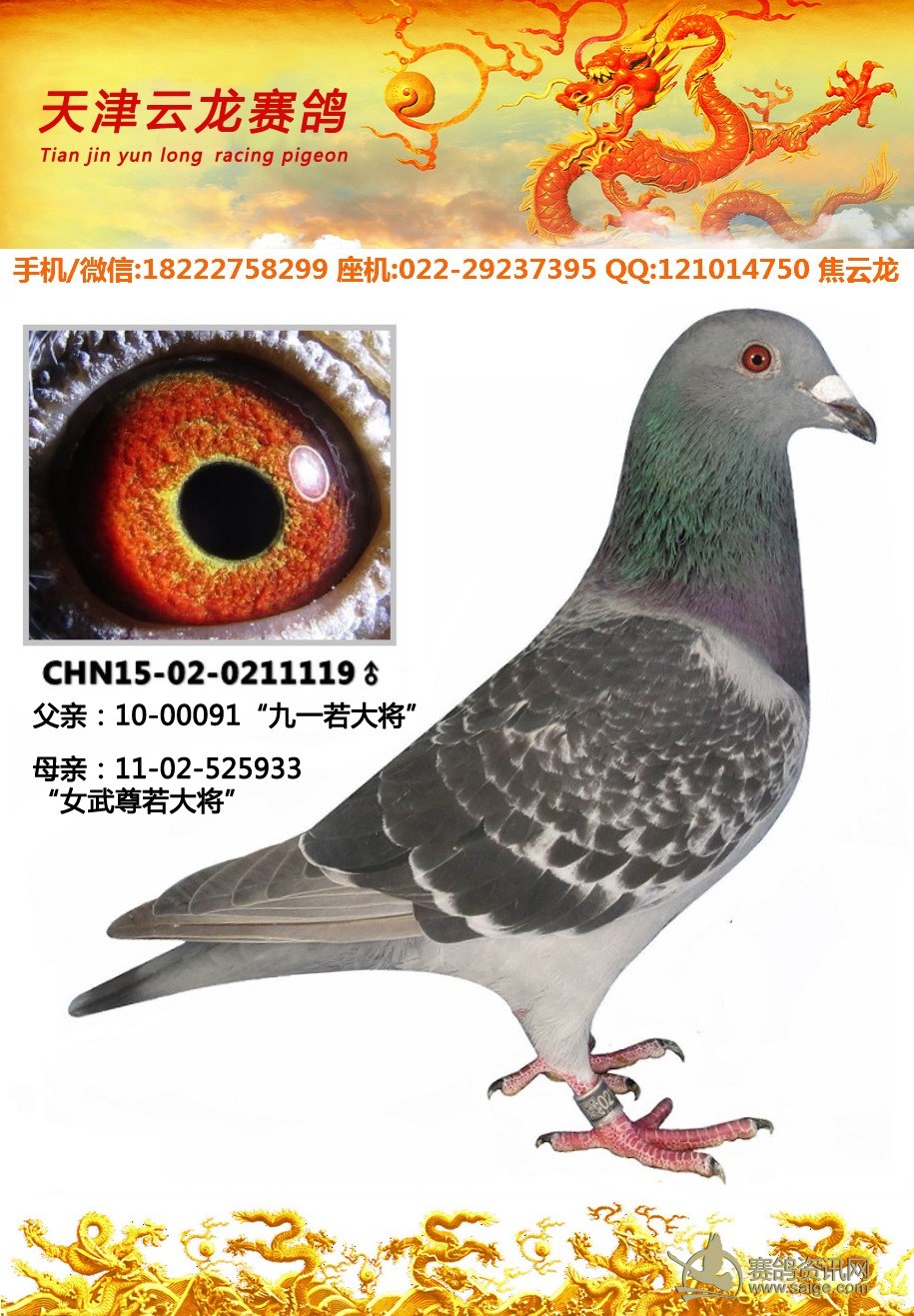 鸽子名称: 足环:2015-02-0211119 性别:♂雄鸽 眼别:黄 羽色:黑斑 年代:2015 血统:若大将 作育者:焦云龙