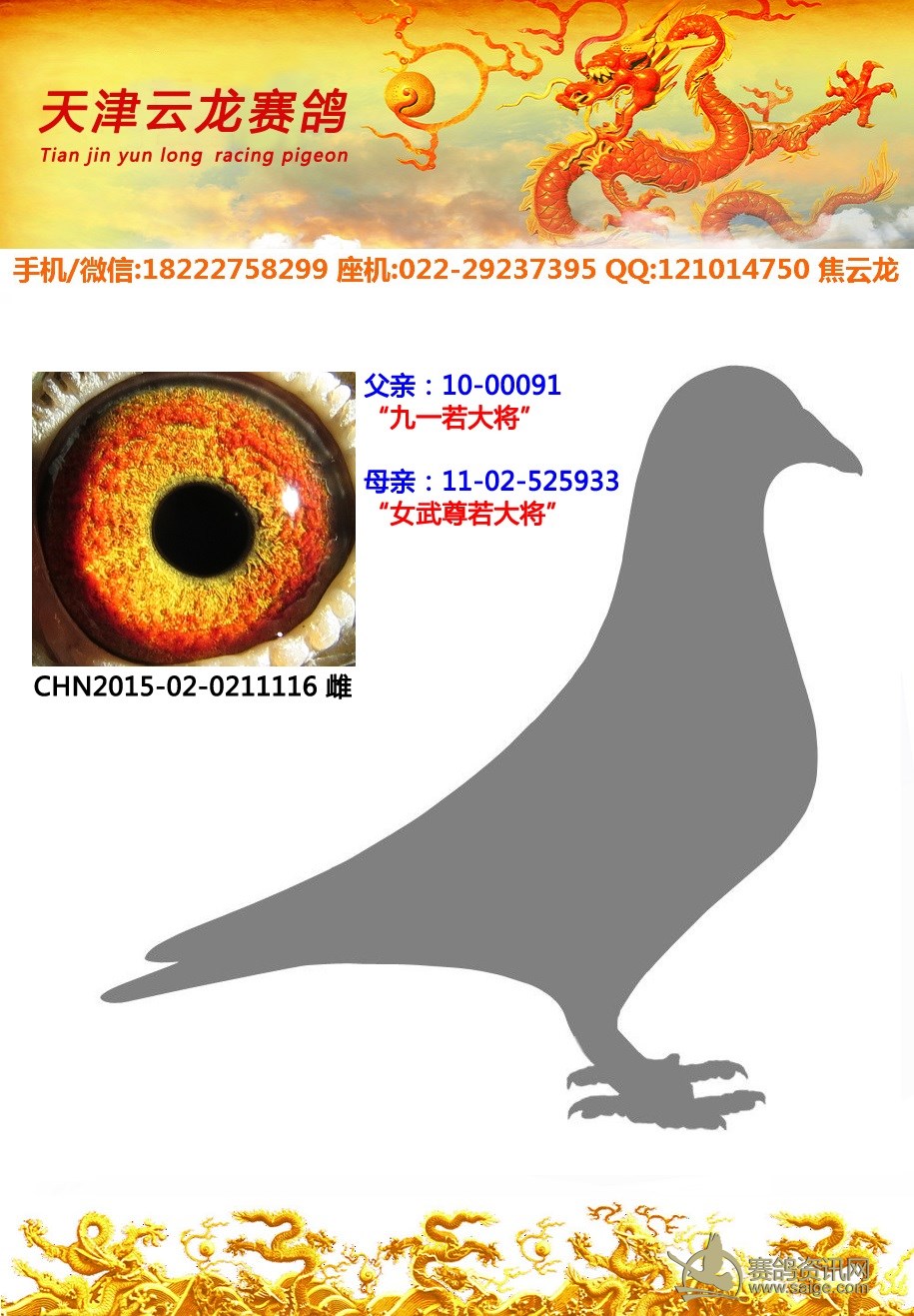 鸽子名称: 足环:2015-02-0211116 性别:♀雌鸽 眼别:黄 羽色: 年代:2015 血统:若大将 作育者:焦云龙