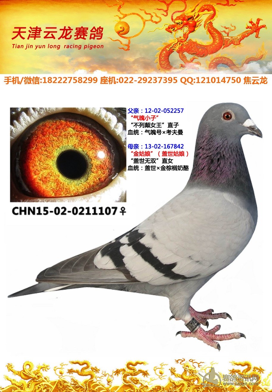 鸽子名称: 足环:2015-02-0211107 性别:♀雌鸽 眼别:黄 羽色:灰 年代:2015 血统: 作育者:焦云龙