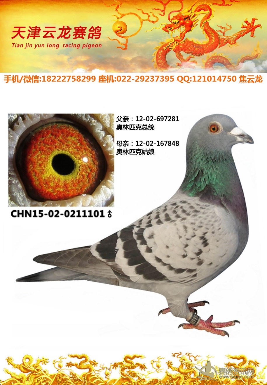 鸽子名称: 足环:2015-02-0211101 性别:♂雄鸽 眼别: 羽色: 年代:2015 血统: 作育者:焦云龙