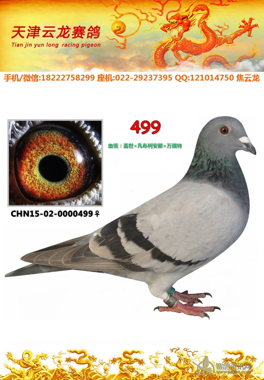 鸽子名称: 足环:2015-02-0000499 性别:♀雌鸽 眼别:黄 羽色:灰 年代:2015 血统:盖世 作育者:焦云龙