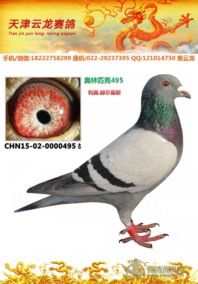 鸽子名称: 足环:2015-02-0000495 性别:♂雄鸽 眼别:砂 羽色:灰 年代:2015 血统: 作育者:焦云龙