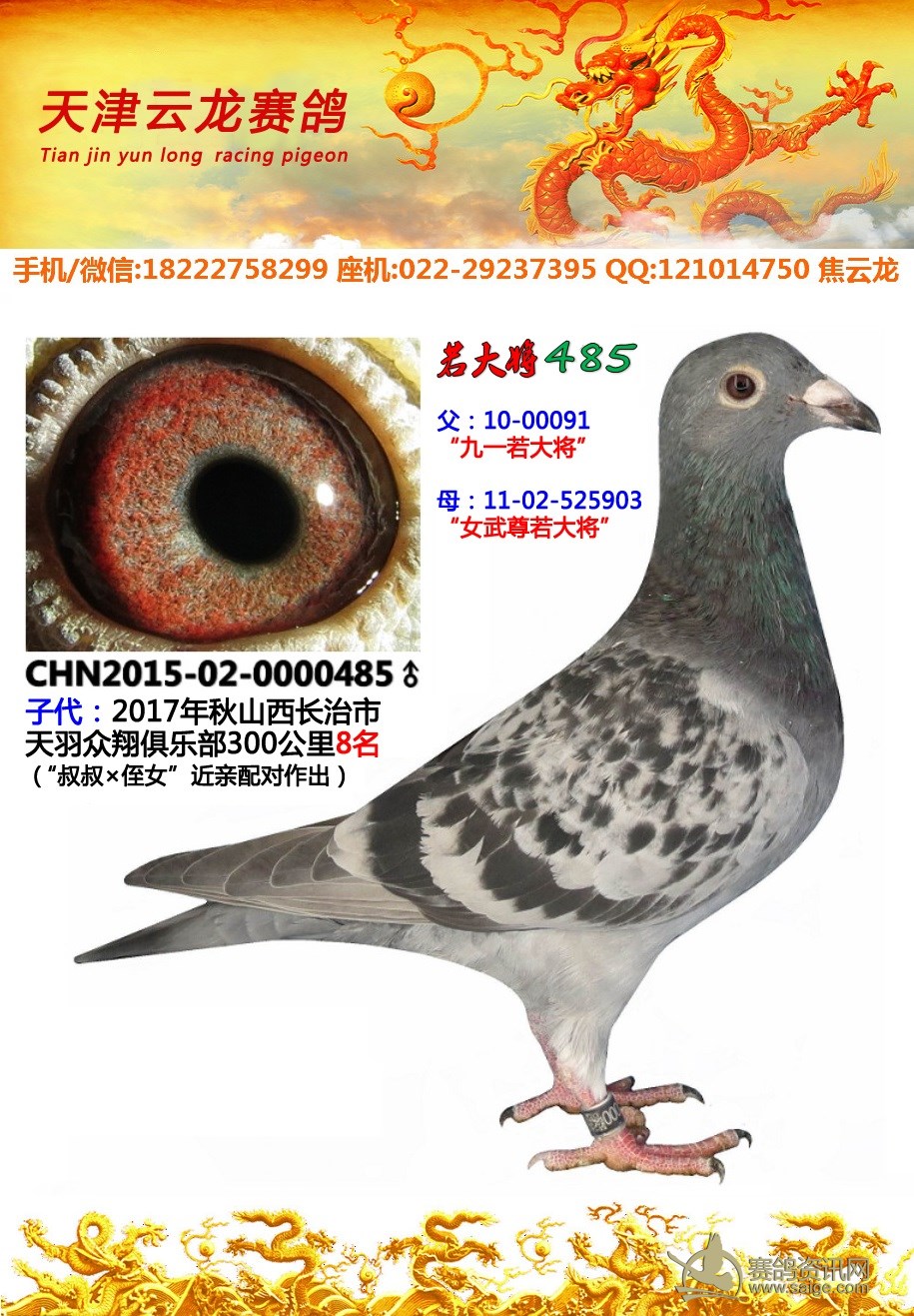 鸽子名称: 足环:2015-02-0000485 性别:♂雄鸽 眼别:砂 羽色:黑斑 年代:2015 血统:若大将 作育者:焦云龙