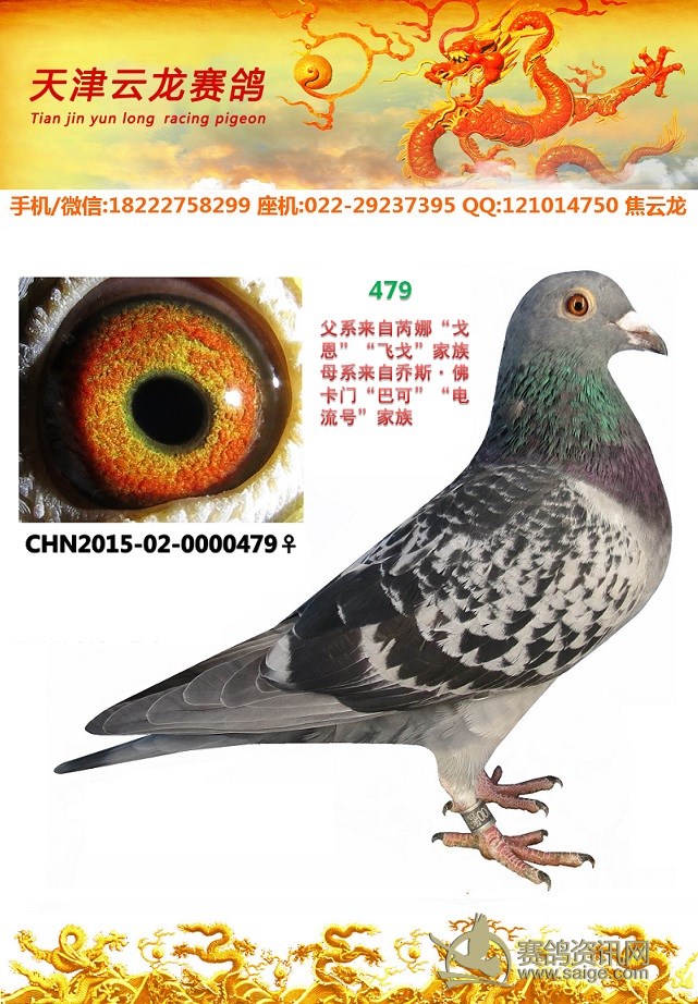 鸽子名称: 足环:2015-02-0000479 性别:♀雌鸽 眼别: 羽色: 年代:2015 血统: 作育者:焦云龙