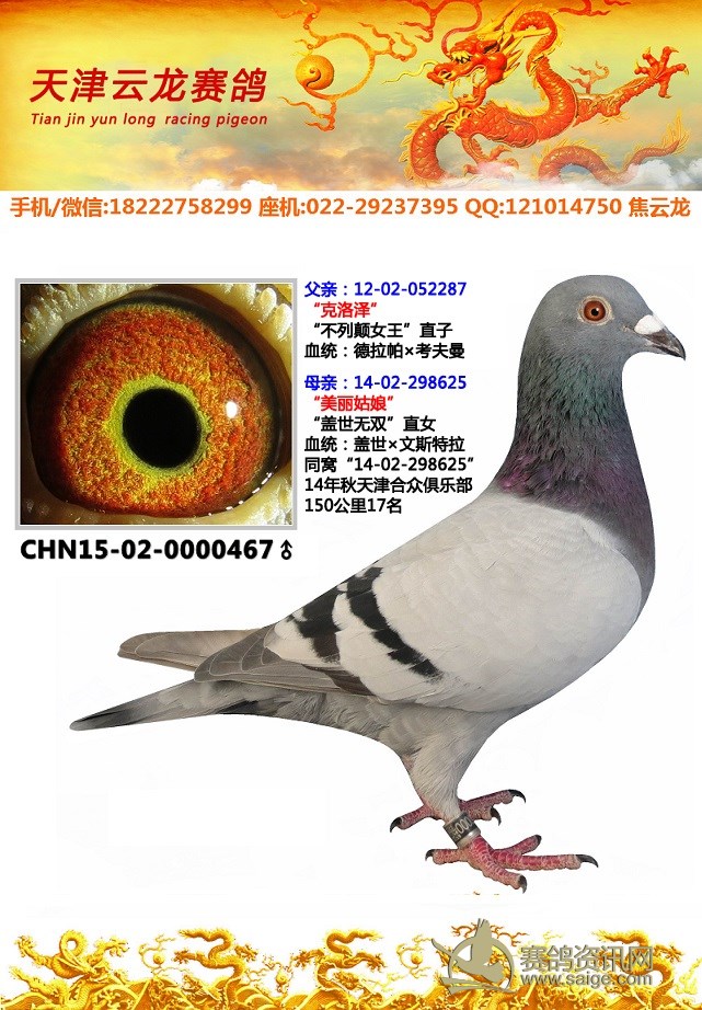 鸽子名称: 足环:2015-02-0000467 性别:♂雄鸽 眼别: 羽色: 年代:2015 血统: 作育者:焦云龙