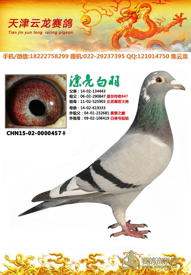 鸽子名称: 足环:2015-02-0000457 性别:♀雌鸽 眼别: 羽色: 年代:2015 血统: 作育者:焦云龙