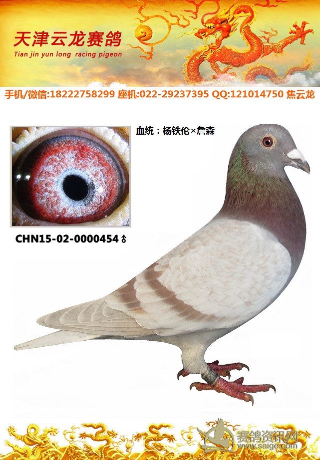 鸽子名称: 足环:2015-02-0000454 性别:♂雄鸽 眼别: 羽色: 年代:2015 血统: 作育者:焦云龙