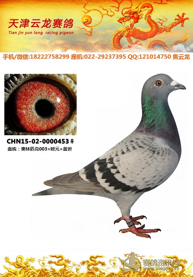 鸽子名称: 足环:2015-02-0000453 性别:♀雌鸽 眼别: 羽色: 年代: 血统: 作育者: