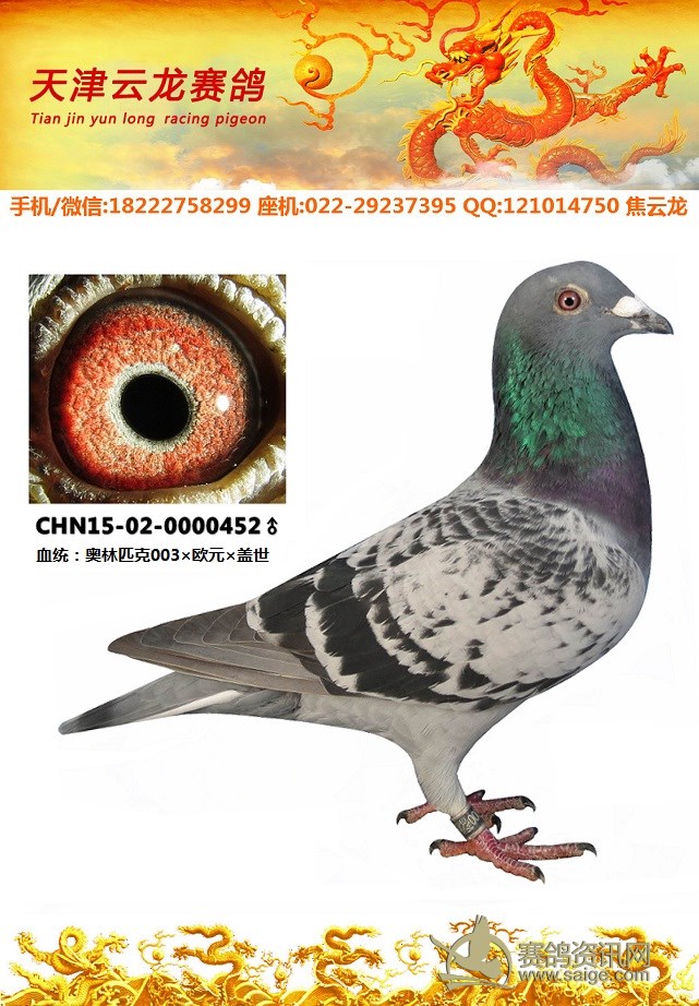 鸽子名称: 足环:2015-02-0000452 性别:♂雄鸽 眼别: 羽色: 年代:2015 血统: 作育者:焦云龙