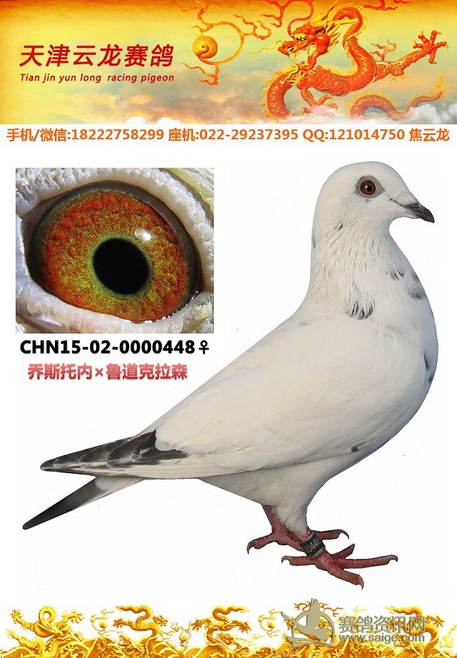 鸽子名称: 足环:2015-02-0000448 性别:♀雌鸽 眼别: 羽色: 年代:2015 血统: 作育者:焦云龙
