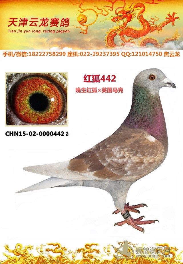 鸽子名称: 足环:2015-02-0000442 性别:♂雄鸽 眼别: 羽色: 年代:2015 血统: 作育者:焦云龙