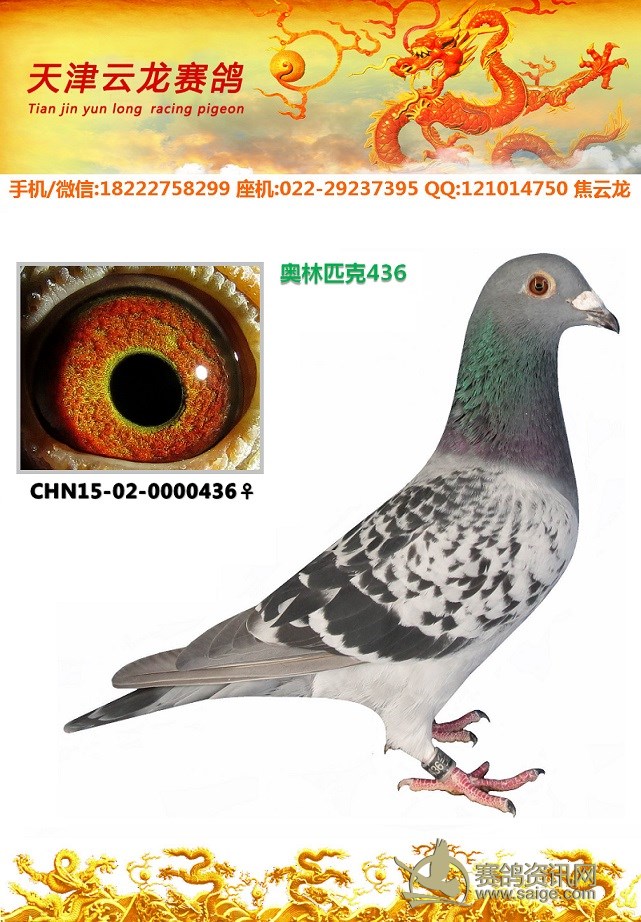 鸽子名称: 足环:2015-02-0000436 性别:♀雌鸽 眼别: 羽色: 年代:2015 血统: 作育者:焦云龙
