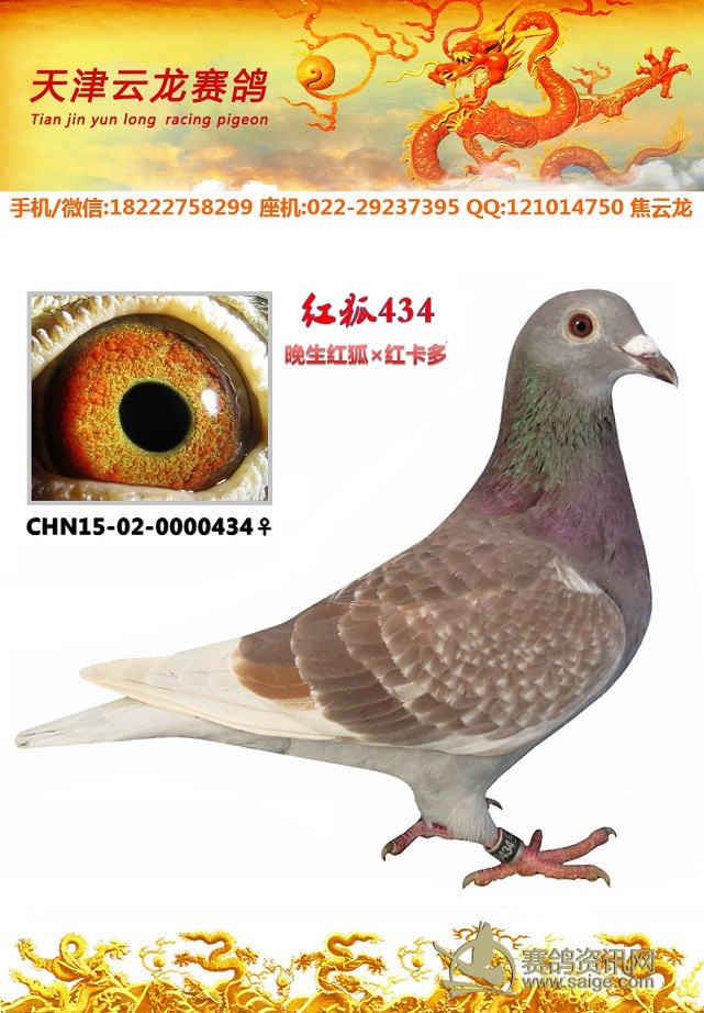 鸽子名称: 足环:2015-02-0000434 性别:♀雌鸽 眼别: 羽色: 年代:2015 血统: 作育者:焦云龙