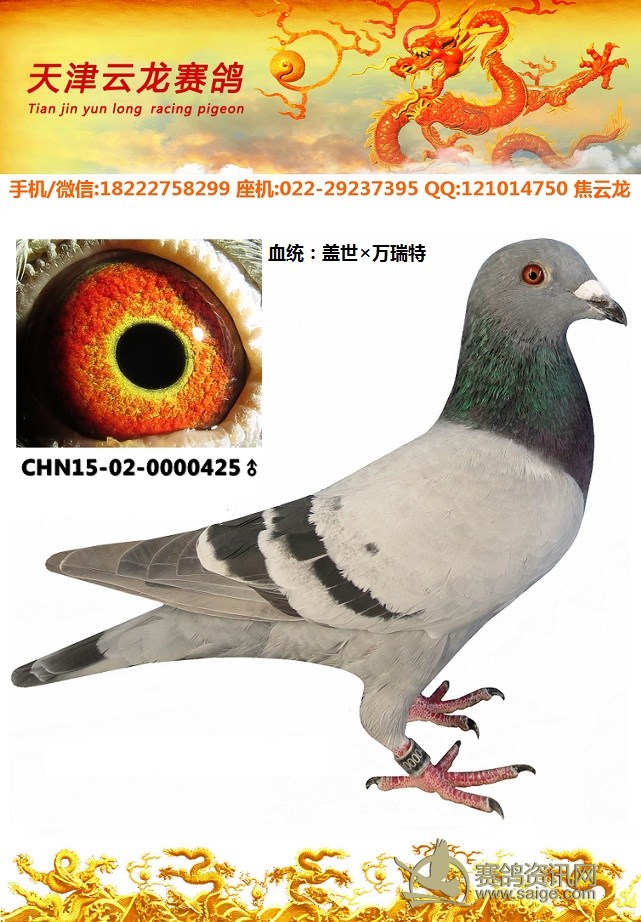 鸽子名称: 足环:15-02-0000425 性别:♂雄鸽 眼别: 羽色: 年代:2015 血统: 作育者:焦云龙