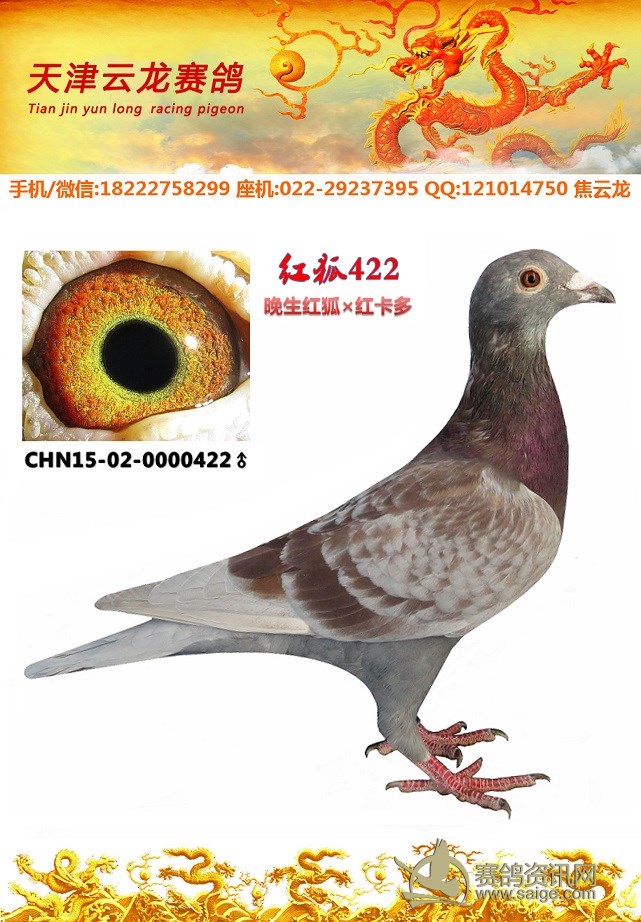 鸽子名称: 足环:2015-02-0000422 性别:♂雄鸽 眼别: 羽色: 年代:2015 血统: 作育者:焦云龙