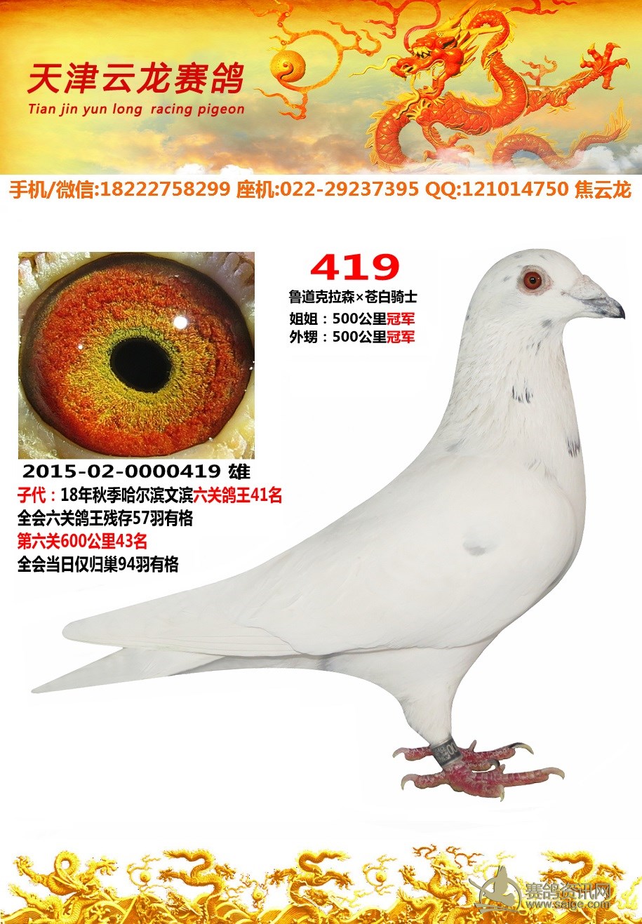 鸽子名称: 足环:2015-02-0000419 性别:♂雄鸽 眼别: 羽色: 年代:2015 血统: 作育者:焦云龙