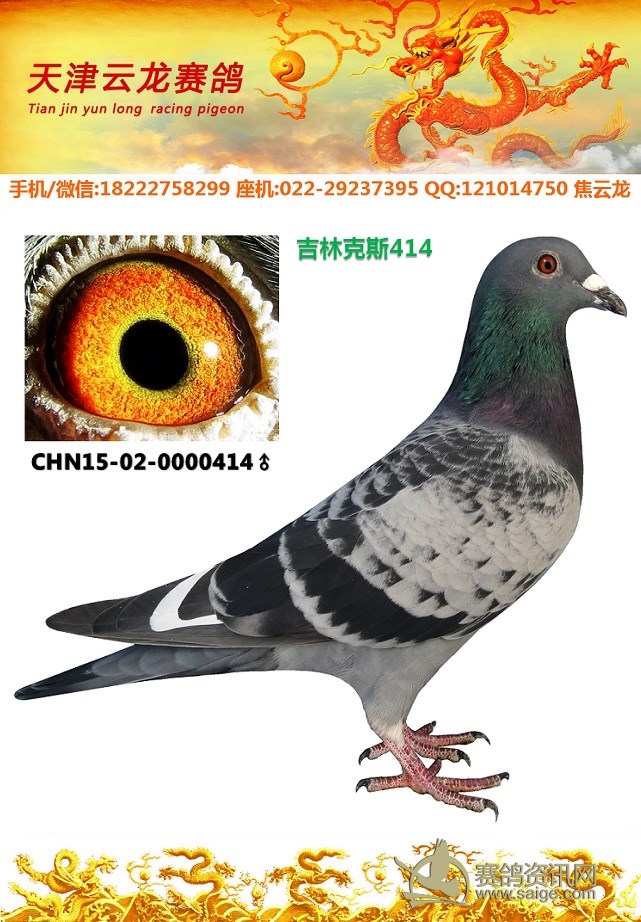 鸽子名称: 足环:2015-02-0000414 性别:♂雄鸽 眼别: 羽色: 年代:2015 血统: 作育者:焦云龙