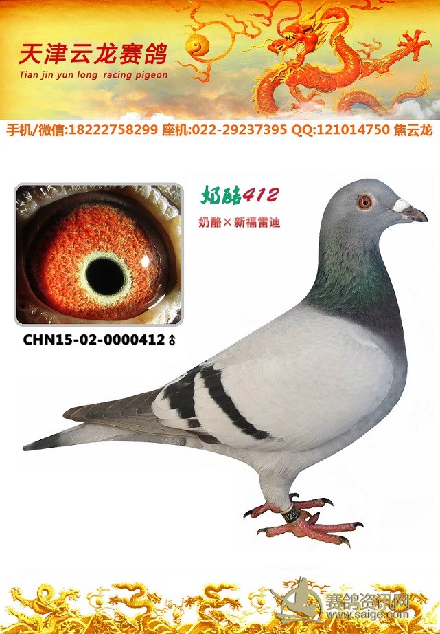 鸽子名称: 足环:2015-02-0000412 性别:♂雄鸽 眼别: 羽色: 年代:2015 血统: 作育者:焦云龙