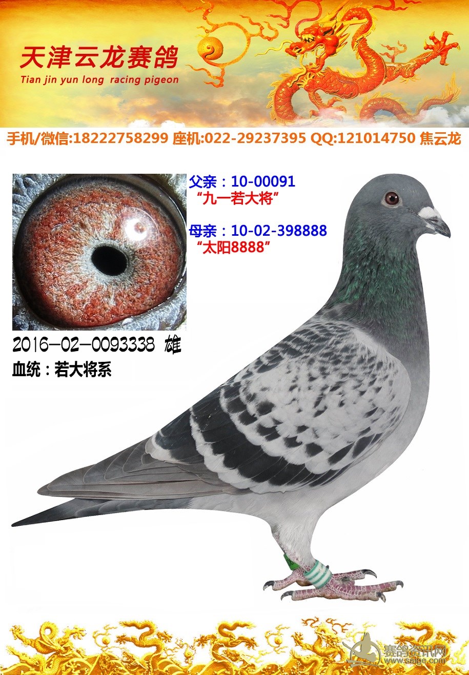 鸽子名称: 足环:2016-02-0093338 性别:♂雄鸽 眼别: 羽色: 年代:2016 血统: 作育者:焦云龙
