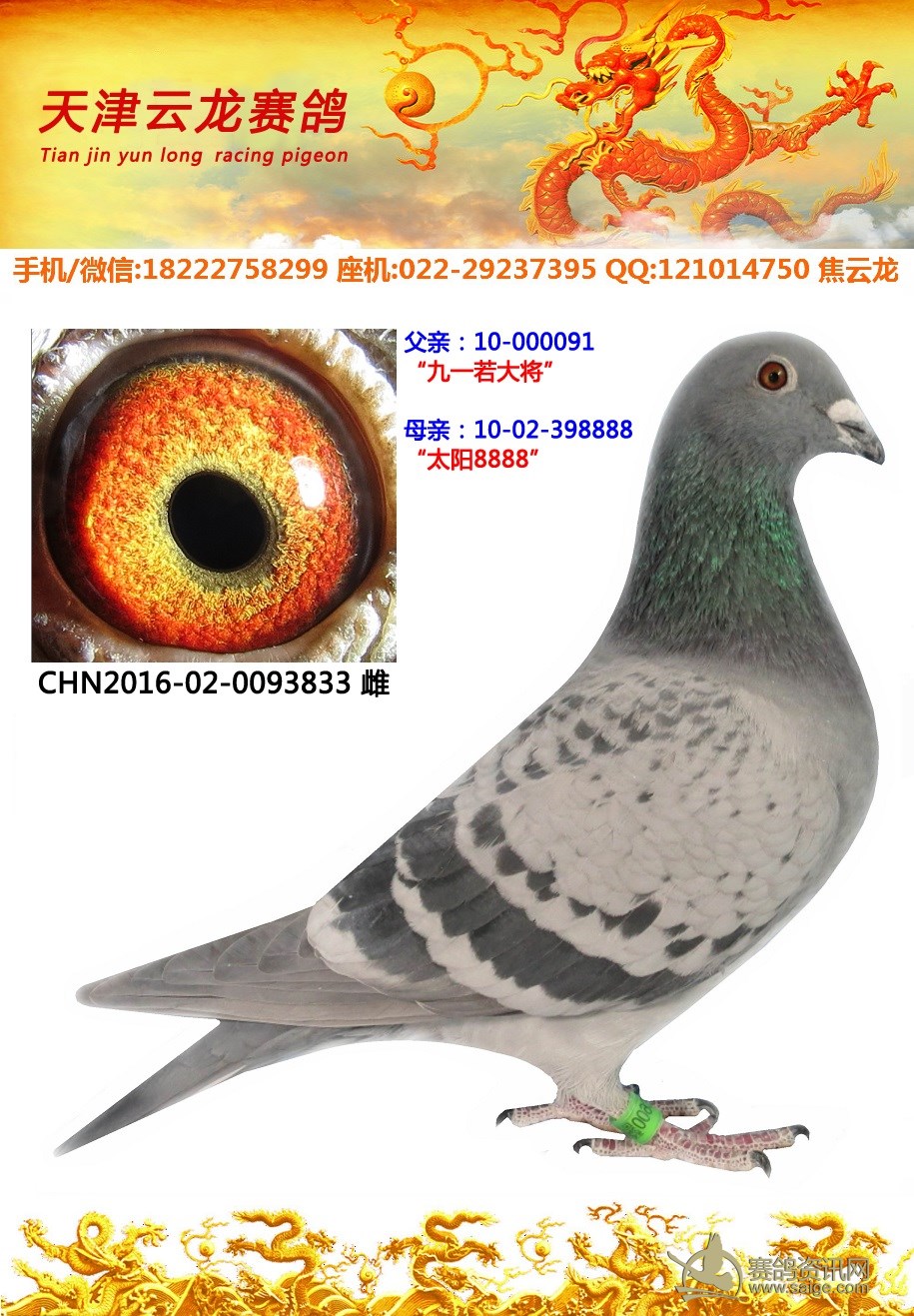 鸽子名称: 足环:2016-02-0093833 性别:♀雌鸽 眼别: 羽色: 年代:2016 血统: 作育者:焦云龙