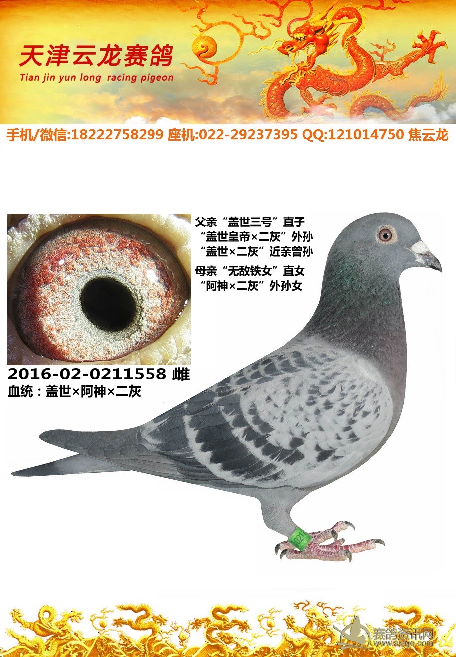 鸽子名称: 足环:2016-02-0211558 性别:♀雌鸽 眼别: 羽色: 年代:2016 血统: 作育者:焦云龙