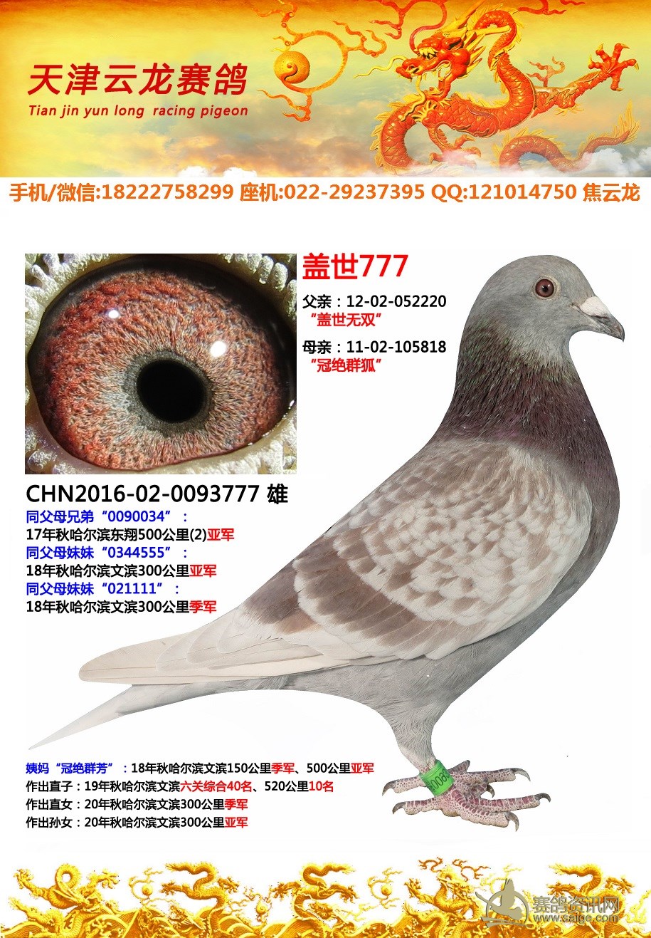 鸽子名称: 足环:2016-02-0093777 性别:♂雄鸽 眼别:砂 羽色:红斑 年代:2016 血统:盖世 作育者:焦云龙