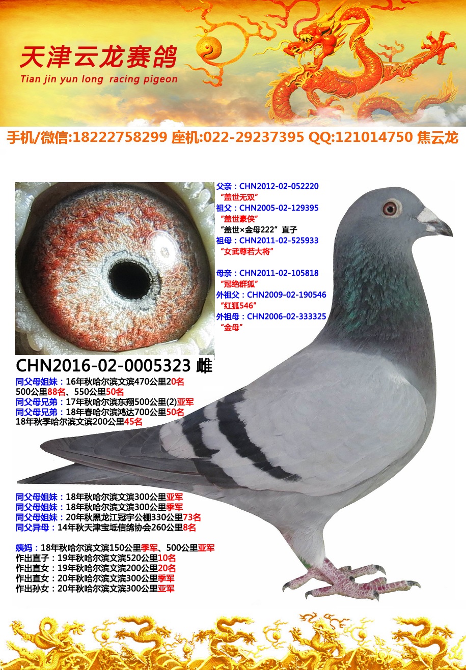 鸽子名称: 足环:2016-02-0005323 性别:♀雌鸽 眼别:砂 羽色:灰 年代:2016 血统:盖世 作育者:焦云龙