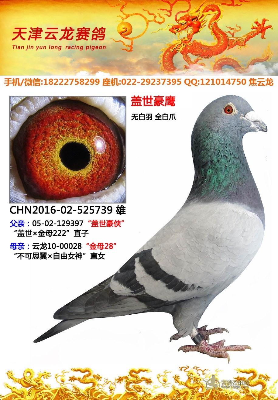 鸽子名称: 足环:2011-02-525739 性别:♂雄鸽 眼别:黄 羽色:灰 年代:2011 血统:盖世 作育者:焦云龙
