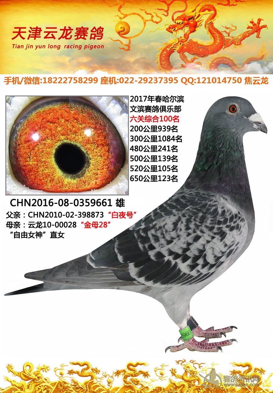 鸽子名称: 足环:2016-08-0359661 性别:♂雄鸽 眼别: 羽色: 年代:2016 血统: 作育者:焦云龙