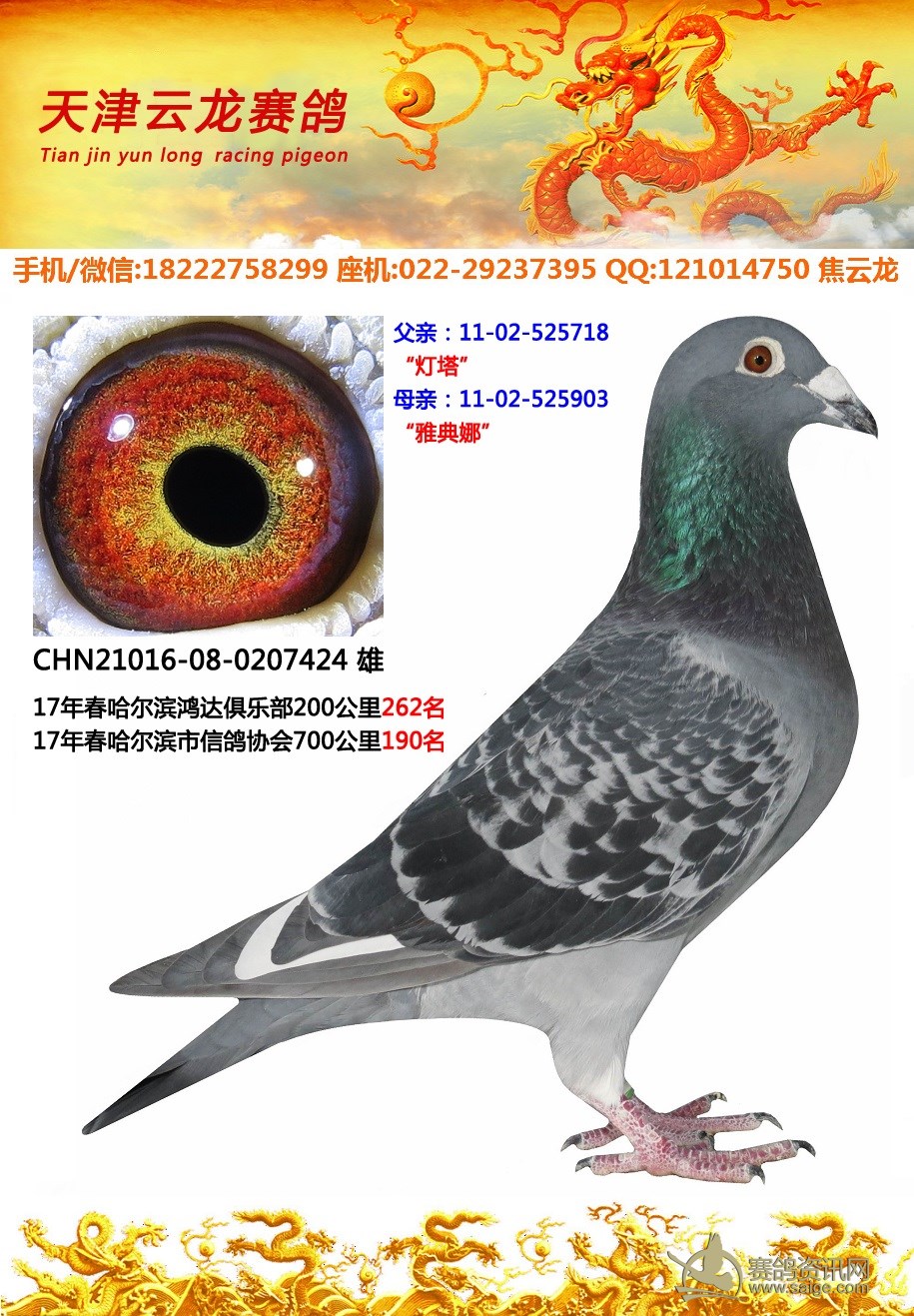 鸽子名称: 足环:2016-08-0207424 性别:♂雄鸽 眼别: 羽色: 年代:2016 血统: 作育者:焦云龙