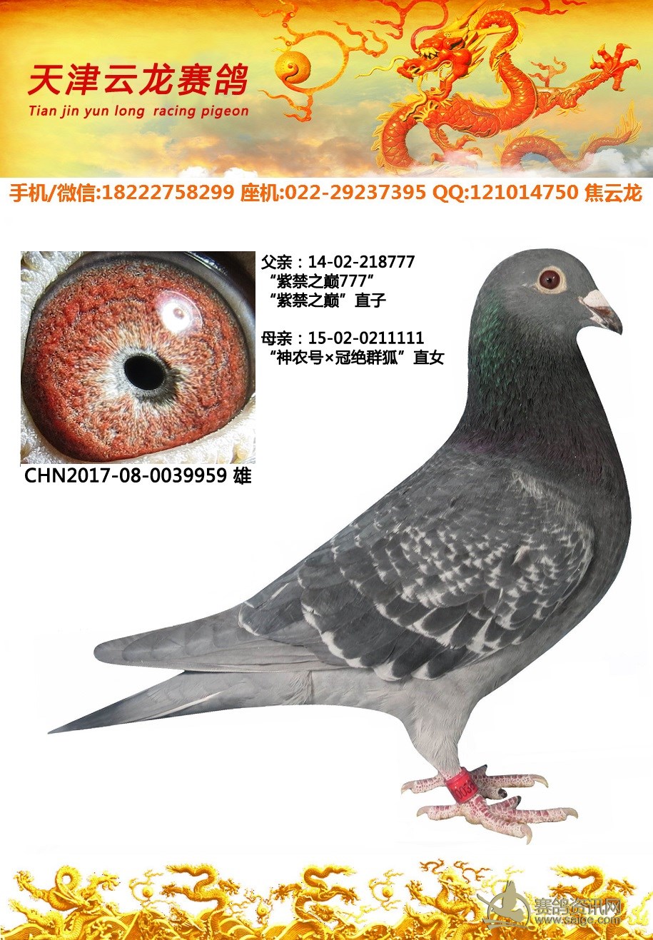 鸽子名称: 足环:2017-08-0039959 性别:♂雄鸽 眼别: 羽色: 年代:2017 血统: 作育者:焦云龙