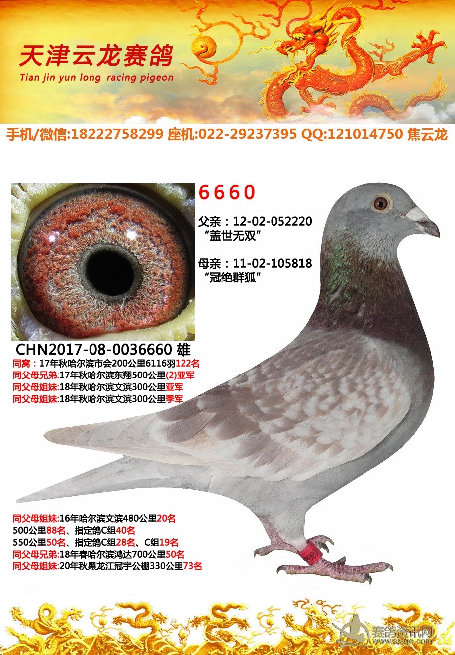 鸽子名称: 足环:2017-08-0036660 性别:♂雄鸽 眼别: 羽色: 年代:2017 血统:盖世 作育者:焦云龙