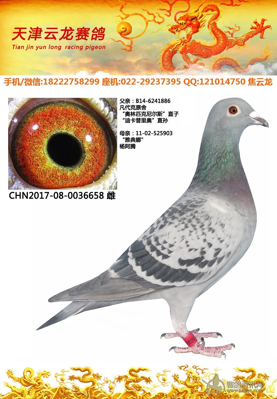 鸽子名称: 足环:2017-08-0036658 性别:♀雌鸽 眼别: 羽色: 年代:2017 血统: 作育者:焦云龙