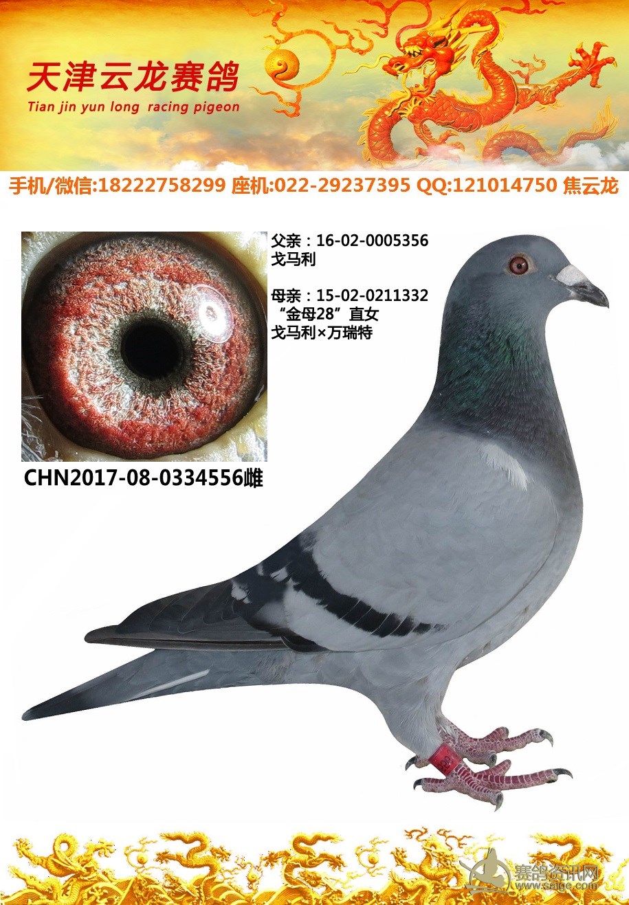 鸽子名称: 足环:2017-08-0334556 性别:♀雌鸽 眼别: 羽色: 年代:2017 血统: 作育者:焦云龙