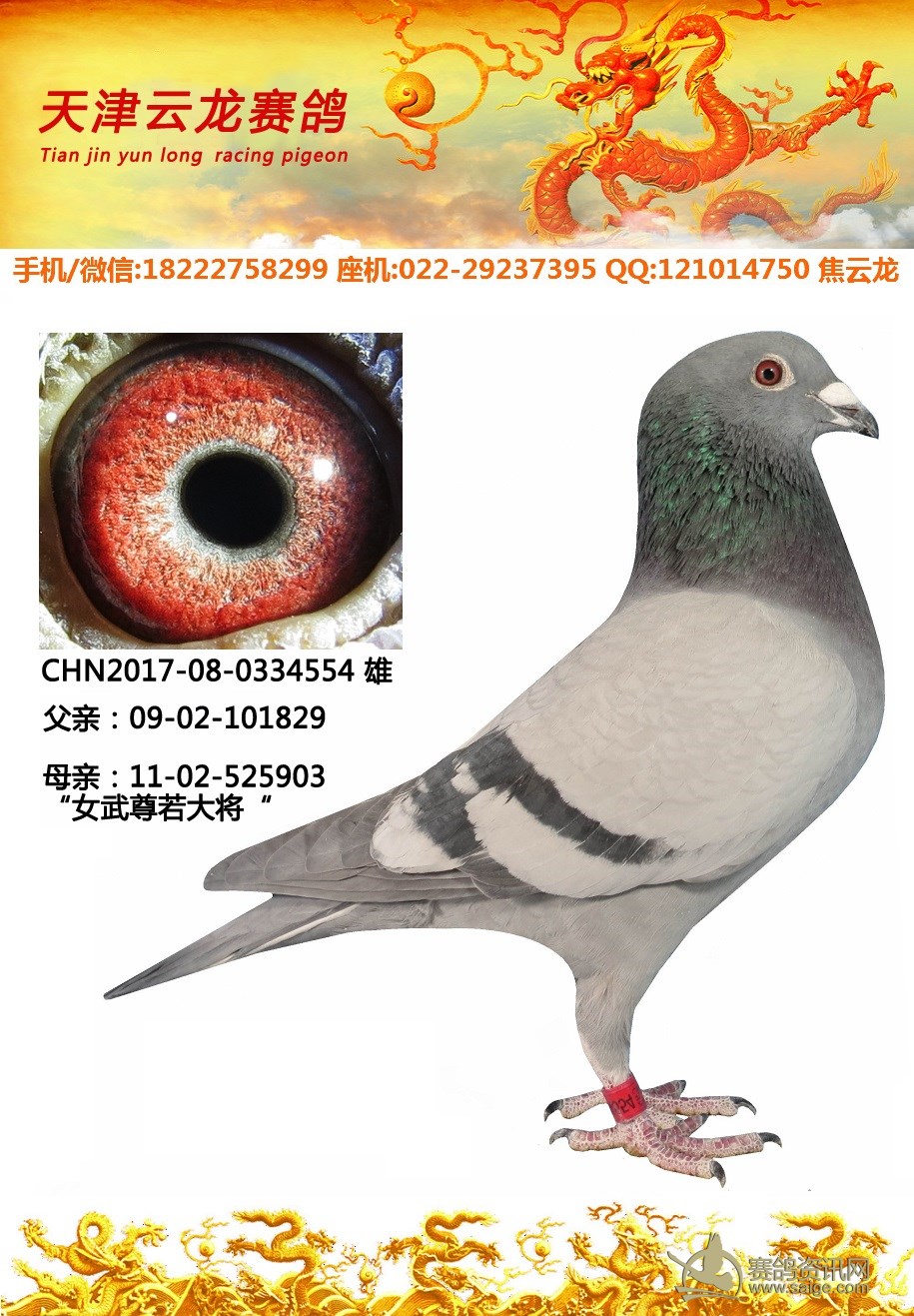 鸽子名称: 足环:2017-08-0334554 性别:♂雄鸽 眼别:黄眼 羽色:灰 年代:2017 血统: 作育者:焦云龙