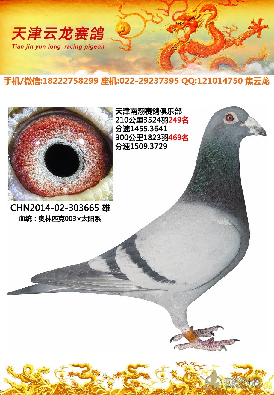 鸽子名称: 足环:2014-02-303665 性别:♂雄鸽 眼别: 羽色: 年代: 血统: 作育者:
