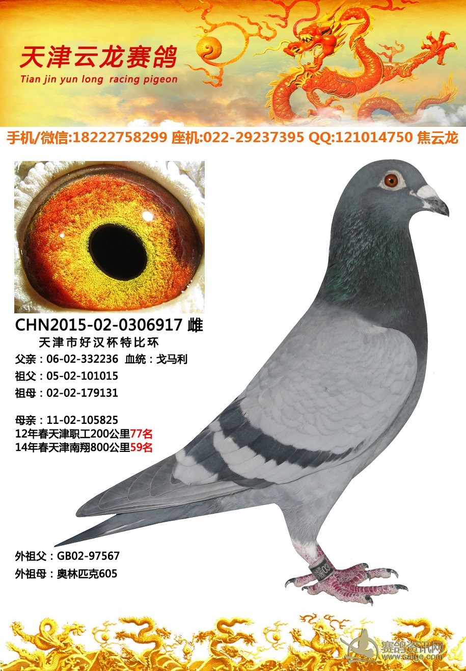 鸽子名称: 足环:2015-02-0306917 性别:♀雌鸽 眼别: 羽色: 年代: 血统: 作育者: